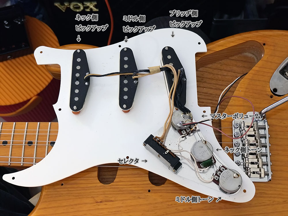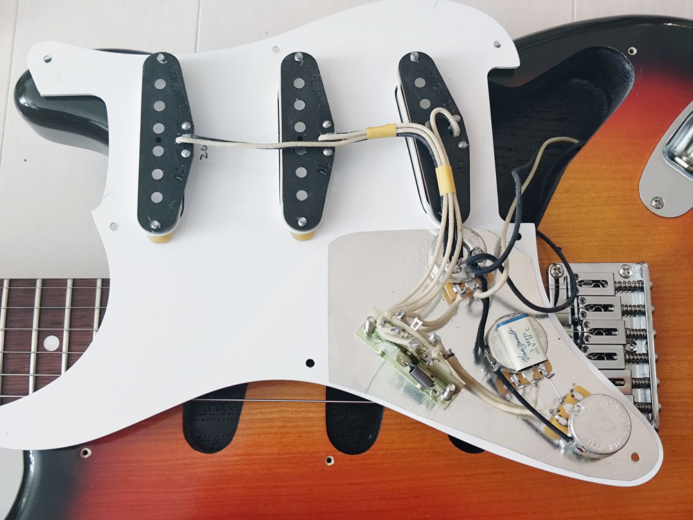 こちらは 1993年製Fender Japan Stratocaster ST54-75 RV の配線の様子。本家アメリカ製の Fender とは違ったパーツが使われているが、配線などはほとんど変わらないと思われる。
