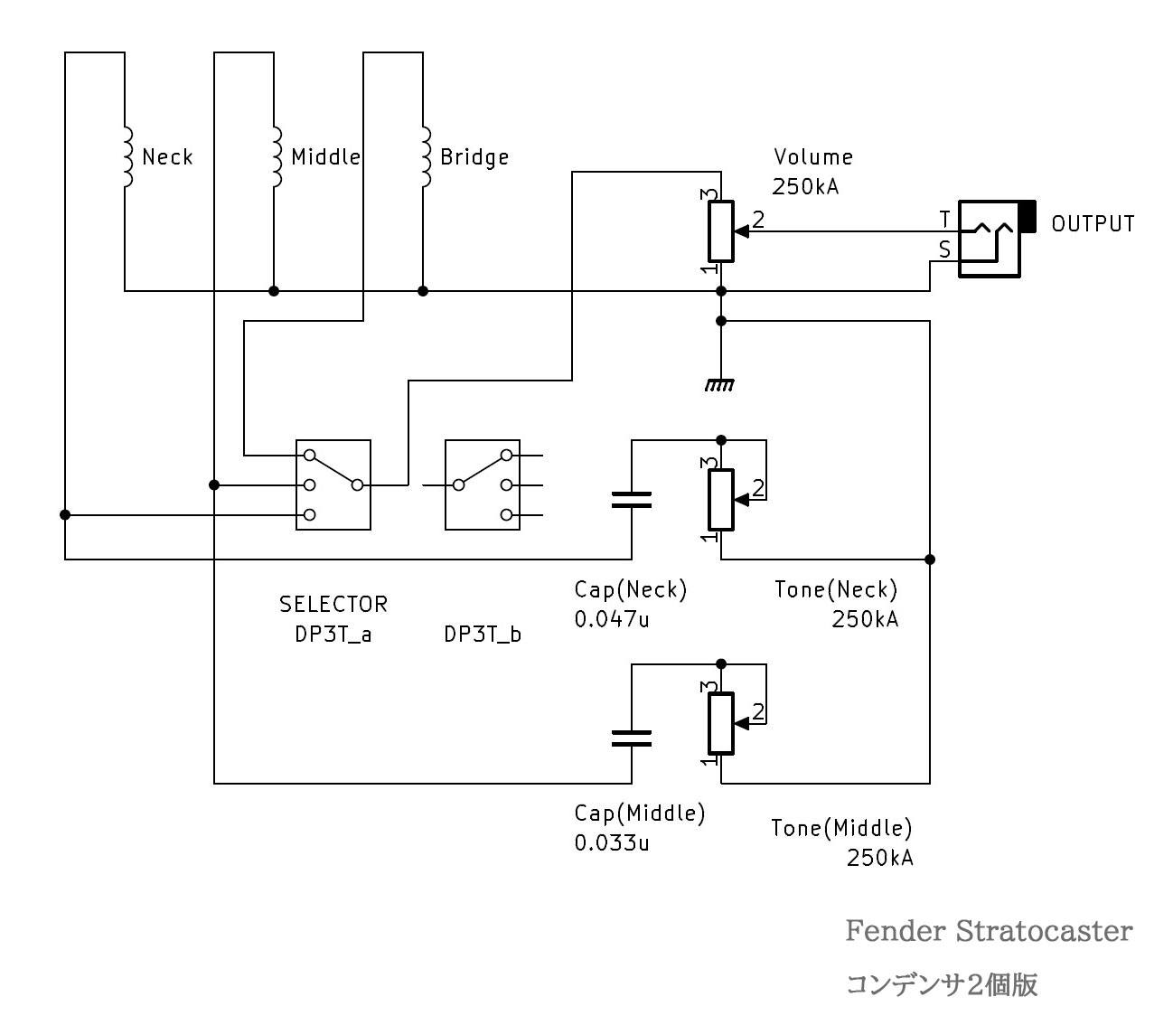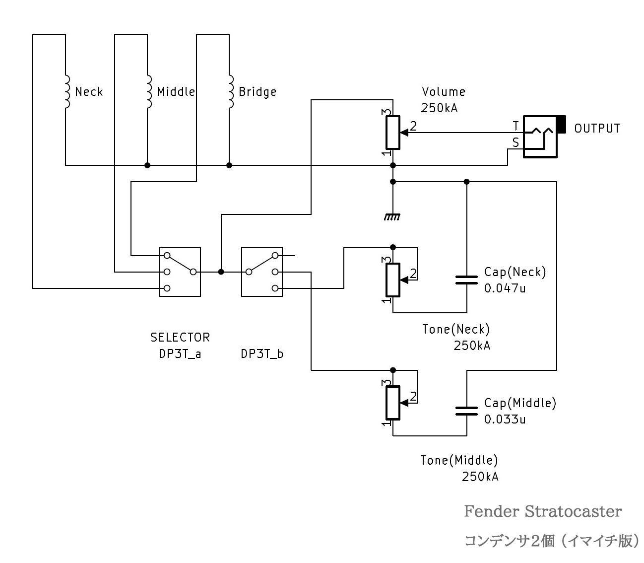 上記と同じ回路を私ならこうやって配線するだろうな、という例。絶対的な正解とは言わないが、少しでも電気回路をわかってる人なら、概ねこの回路に収れんすると思う。コンデンサが 2個必要になる点はネガティブな要素だが、スイッチの接点を減らせること、コンデンサはネック側ピックアップ用と、ミドル側ピックアップ用で別のものを使えるので容量を変えたり、銘柄を変えることができるメリットがある。