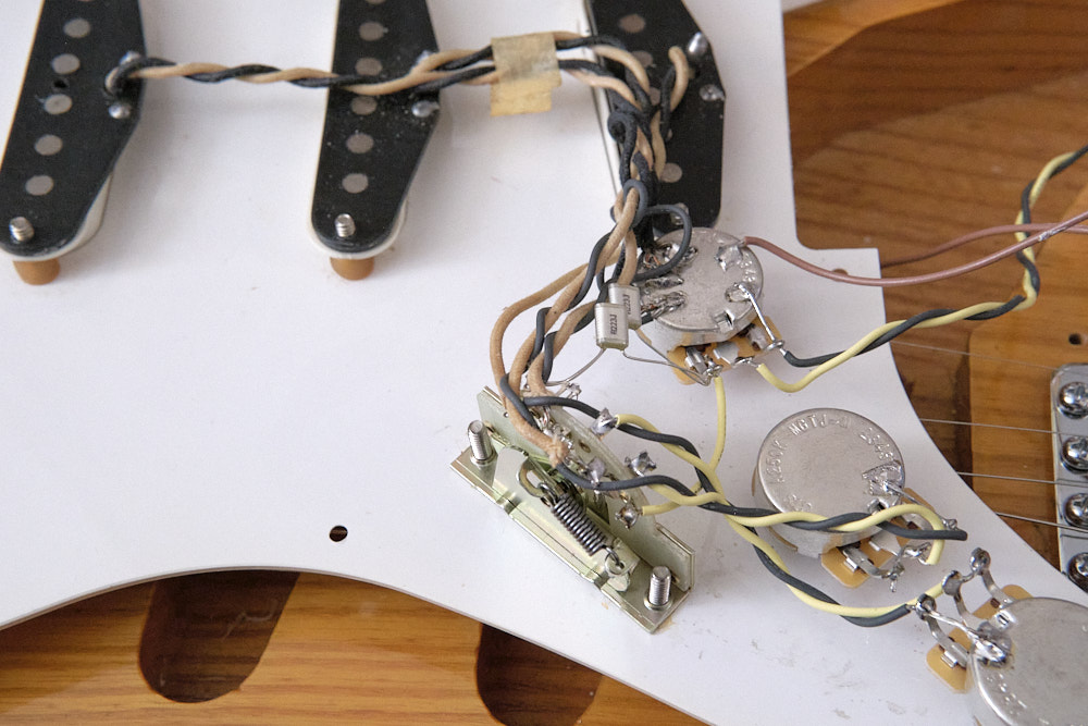 Fender の純正品ではないが、Van Zandt のストラトタイプの楽器の配線の様子。配線材にクロスワイヤー(Gavitt製と思われる)を使うなど、芸が細かい。トーン回路用のコンデンサは Fender のフイルムに似た Van Zandt 0.1uF。