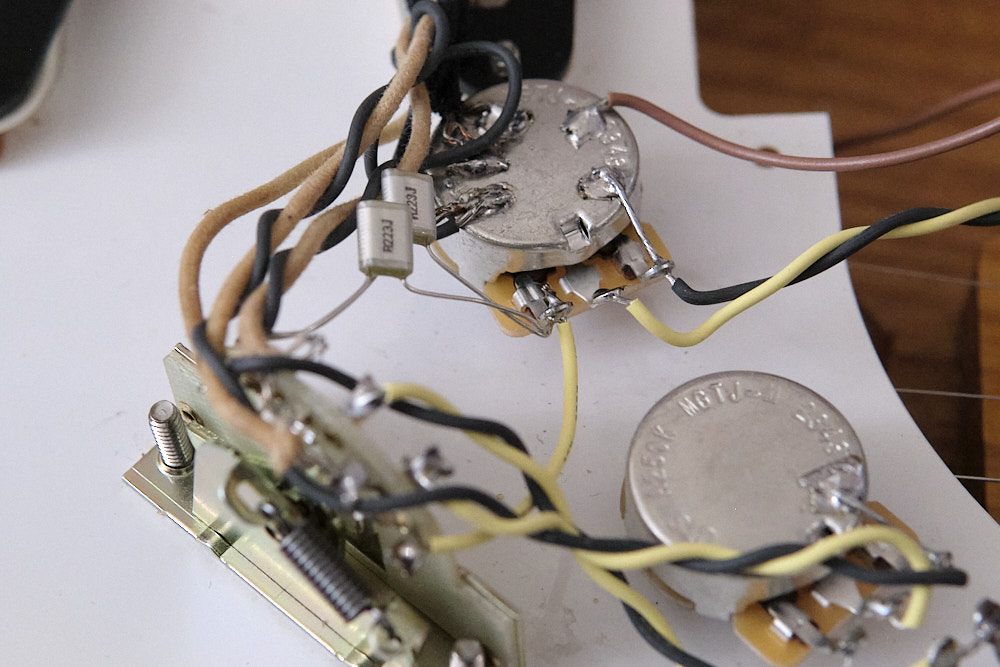 改良型の配線のもうひとつのメリットが、コンデンサを簡単に取り替えることができること。コントロールポットに抱かせていてももちろん取替はできるものの、2個のポット間を渡す配線が必要なので、最低でも 3箇所のハンダをやり直さないといけないが、改良型の場合は両側2箇所のハンダ作業だけで取り替えることができる。