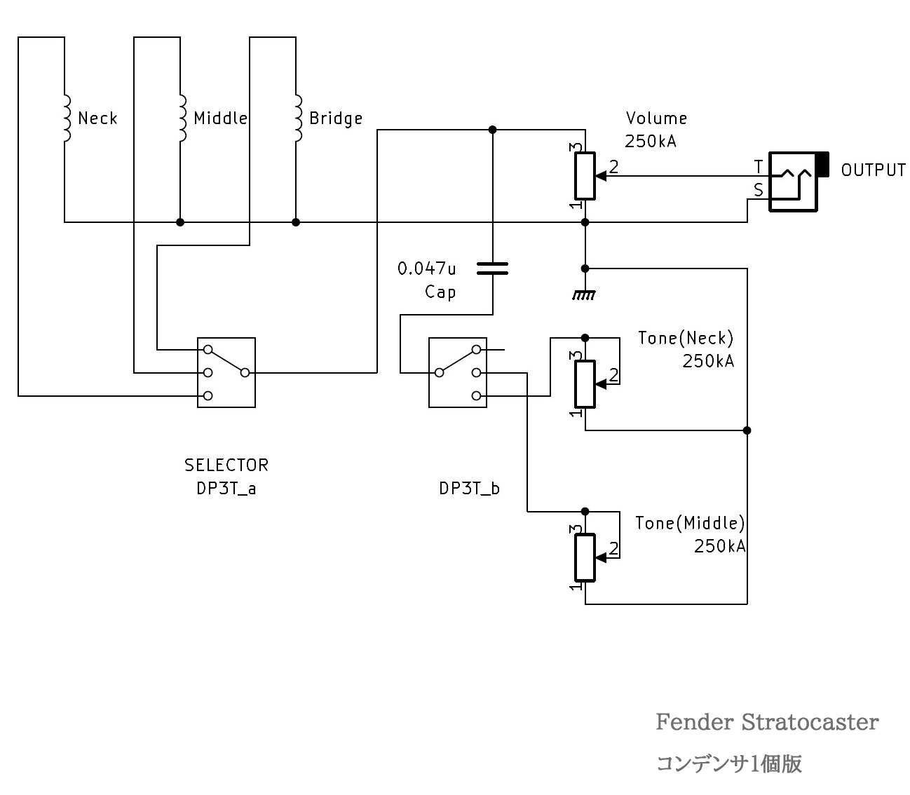 ピックアップの切り替えに使う 3 way のセレクタースイッチだが、伝統的に DP3T のタイプが使われているがこれも回路的には意味がなく、もっとシンプルな SP3T / 1P3T(single-pole / 3-throw,単極3投)のスイッチで事足りる。なぜ、DP3Tスイッチが使われているかというと、トーン回路でネック側ピックアップ用とミドル側ピックアップ用のコンデンサを共有するためだ。