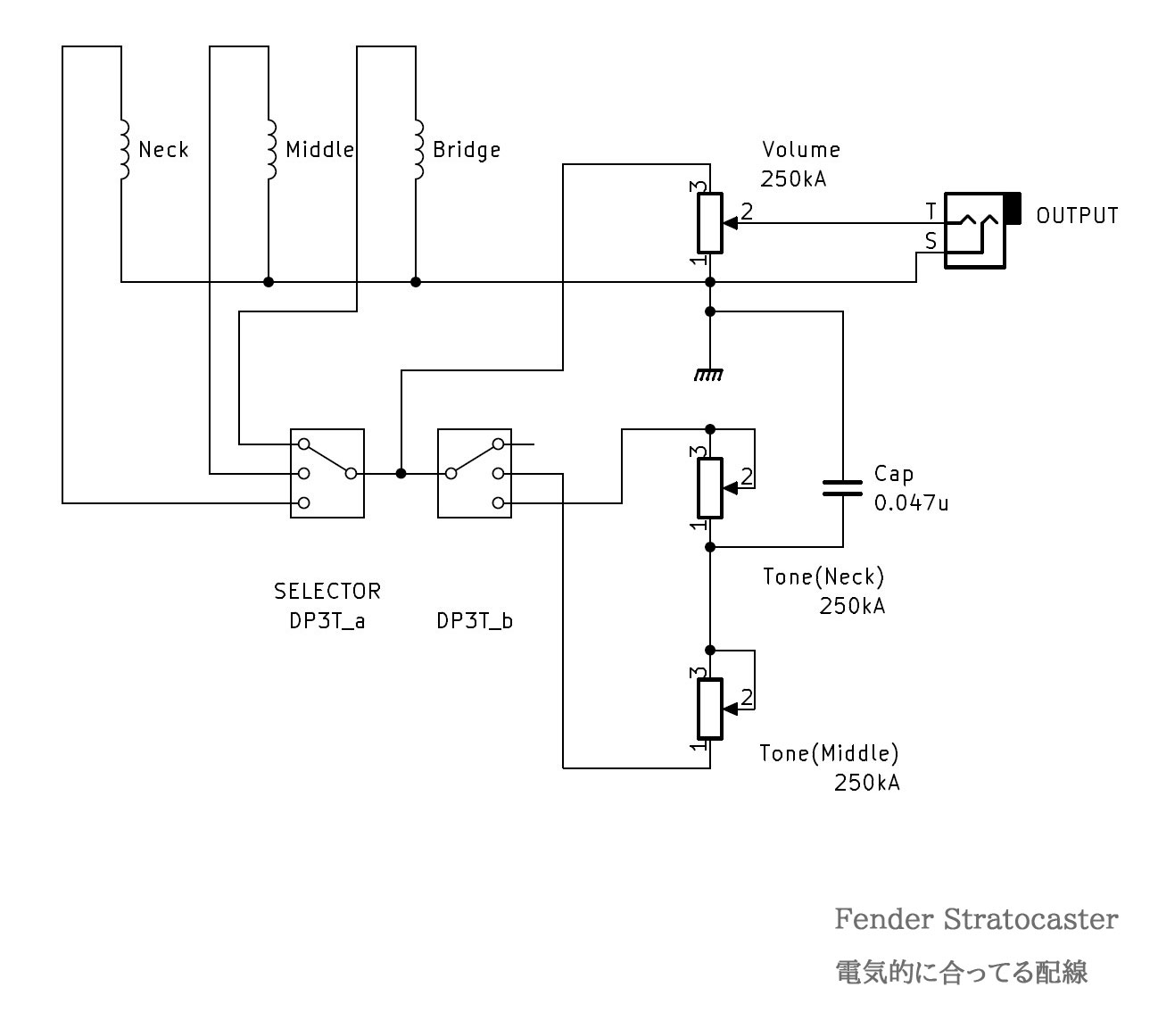 エレキギターの代表的な機種である Fender Stratocaster (以下、ストラト)だが、定番機種にも関わらず疑問に思ってることがある。ウェブで公開されている載らの電気系の配線図が、ことごとくおかしいのである。